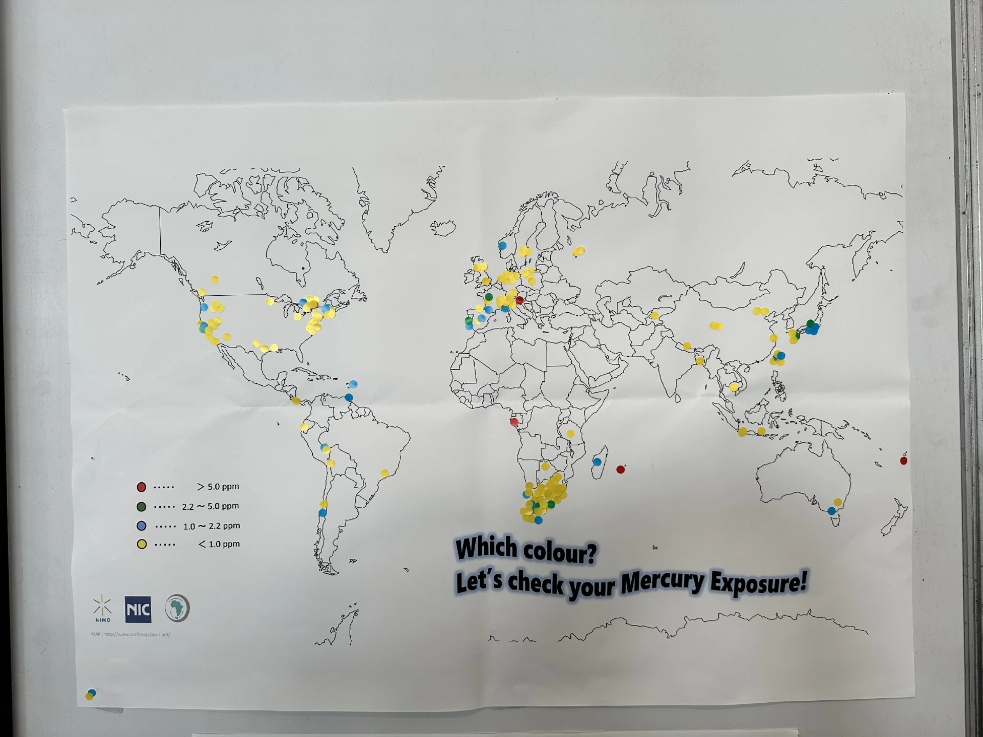 As both a sponsor and exhibitor, Nippon Instruments Corporation had multiple mercury analyzers on display, including a fully operation Model MA-3000 Mercury Analyzer that was used to measure mercury in the attendees’ hair live during the conference. In all, we tested well over 200 hair samples, and each was given a color-coded sticker to place on the world map. This allowed us to develop a heat map for mercury levels around the world based on the attendees of the ICMGP.