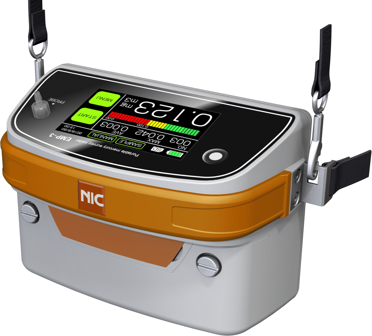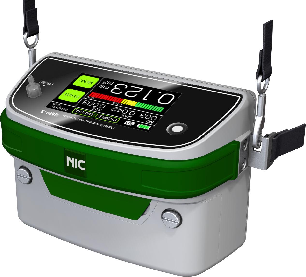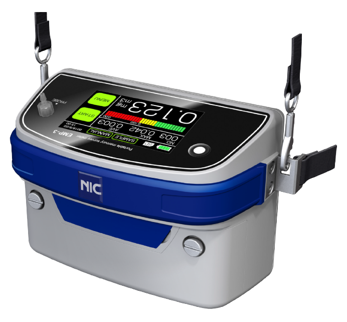 The NIC EMP-3 Mercury Monitor is designed for measuring gaseous mercury in work environments. It is compact, light-weight, battery-powered and can be carried virtually anywhere, making it the perfect tool to measure mercury for occupational health and hygiene monitoring applications by OSHA and NIOSH guidelines. The EMP-3 field-portable mercury survey meter has a lower measurement limit down to 0.1 ug/m3 and a range up to 2,000 ug/m3, and it can measure even higher with the all new dilution option. Measured data is automatically acquired and recorded into a built in data-logger and can be retrieved via PC for data processing. The built-in GPS function automatically stores GPS positions of every measurement, so you no longer need to log your measurement locations. A rechargeable battery can be easily swapped out for external charging. Upgrades allow for versatility into other mercury analysis applications.